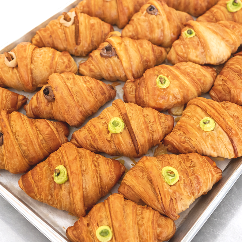 layers of crispy golden phyllo dough rolled and filled with nuts (pistachio or caramel sea-salt). baked until golden and covered with honey.