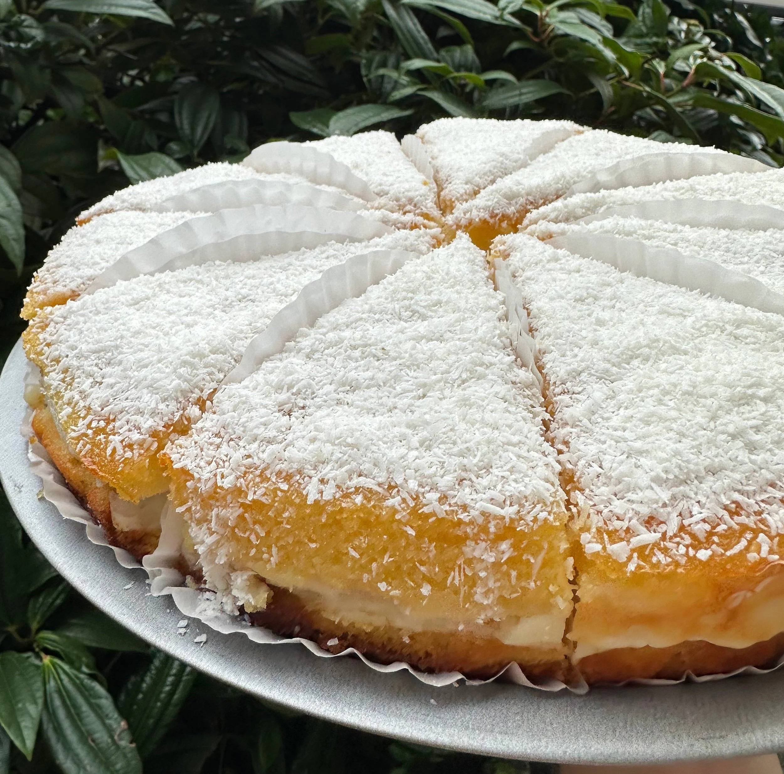 light and fluffy 2-layer semolina cake. coated in sweet syrup and topped with shredded coconut.
